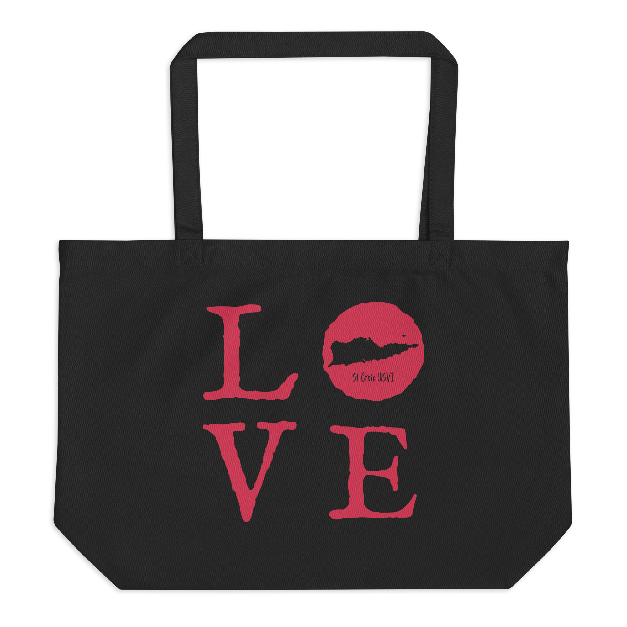 St Croix LOVE Raspberry on Black Large organic tote bag